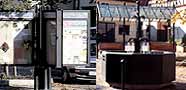 Moeblierung: Baenke, Infotafeln, Daecher, Leuchten, Brunnen etc. aus Holz, Stahl, Glas